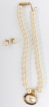 A collection of jewellery including a Majorica faux pearl necklace with silver clasp and pendant, Monet brooch, diamanté necklace, etc