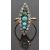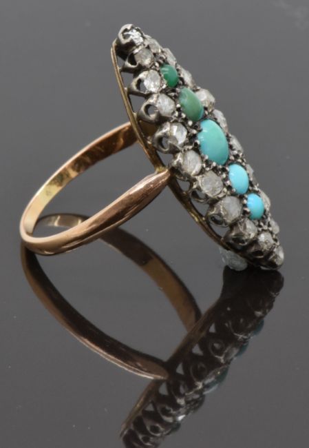 Victorian marquise shaped ring set with turquoise cabochons and rose cut diamonds, 2.9g, size M