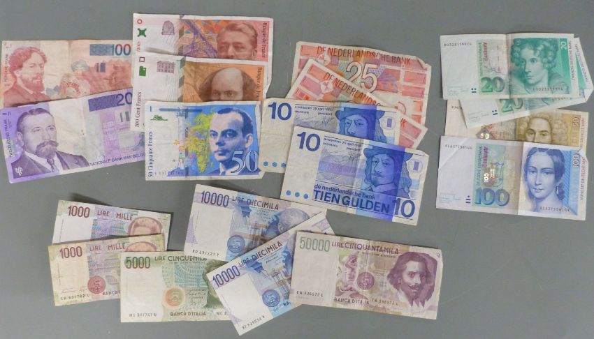 A collection of various UK and overseas coinage and modern crowns including Spitfire and Wright Brothers commemoratives together with some overseas banknotes Italy, Belgium, Netherlands etc