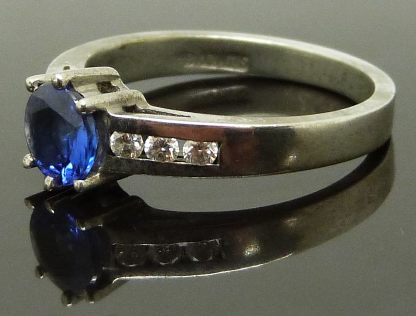 An 18ct white gold ring set with a round cut tanzanite and diamonds to the shoulders, with certificate, size N, 3.30g