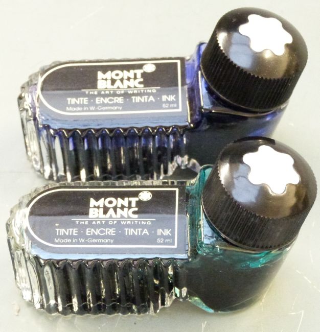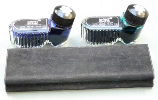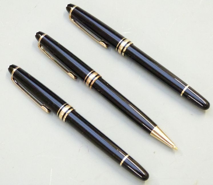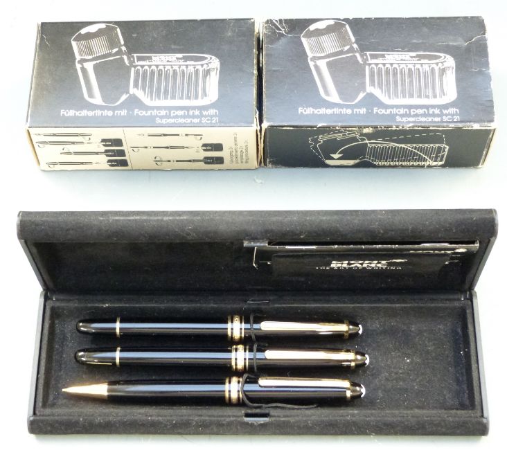 Set of three Montblanc Meisterstuck pens comprising fountain pen with 14ct gold 4810 nib, roller ball pen and propelling pencil, all with black resin bodies and gold plated fittings, in original case with instructions and two bottles of ink in original boxes
