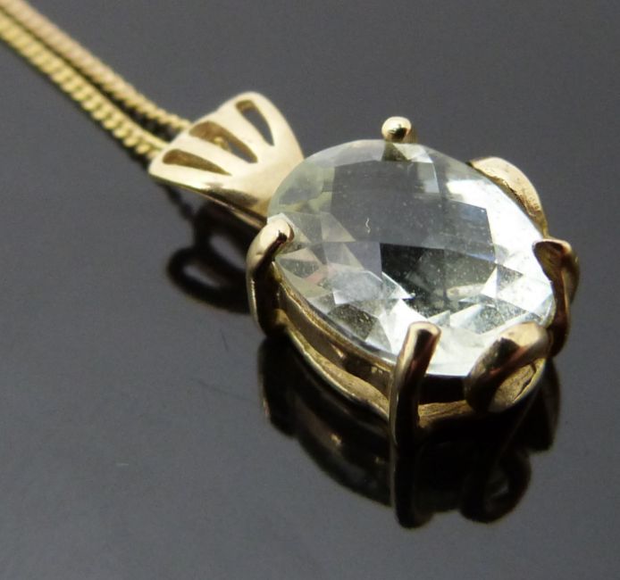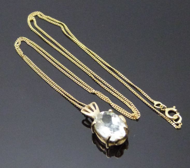 A 9ct gold pedant set with an oval mixed cut aquamarine on a 9ct gold chain, 2.3g