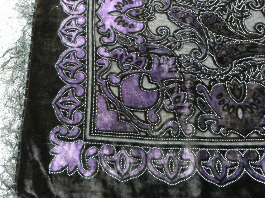 A 19th/20thC black and purple devore velvet shawl with fringe, 130 x 130cm including fringe, a patterned devore velvet scarf 135 x 34cm and a silk scarf/remnant