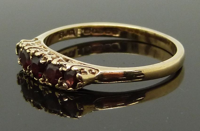 A 9ct gold ring set with garnets, size Q/R, 2.32g