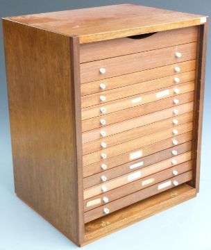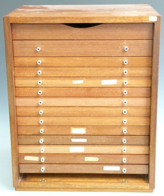 Mahogany fourteen drawer collector's cabinet with removable front, W44 x D35 x H55cm.