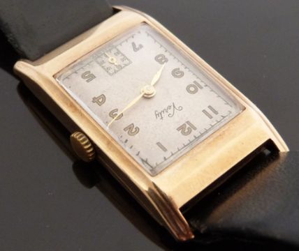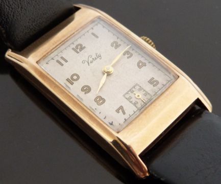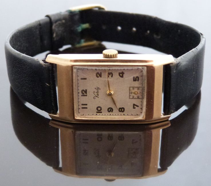 Verity 9ct gold wristwatch with subsidiary seconds dial, gold hands and Arabic numerals, silver face and 15 jewel movement, on black leather strap, case width 22mm, serial number 437970.
