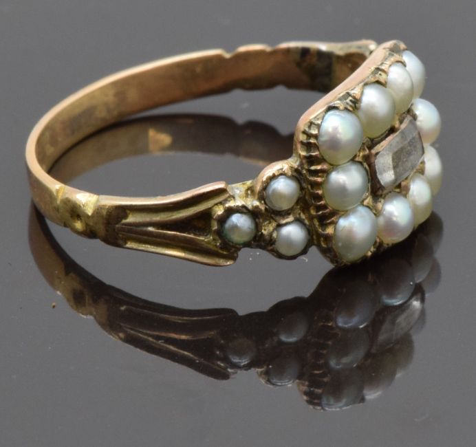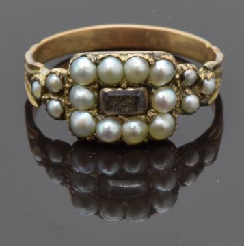 Victorian mourning ring set with hair to the centre surrounded by seed pearls, size O, 2.00g