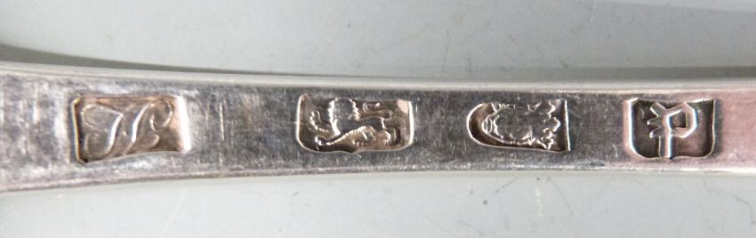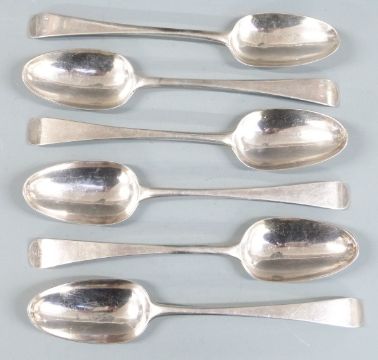 Set of six Georgian bottom hallmarked silver table spoons, London 1770 maker John Lampfert, length 22cm, weight 384g