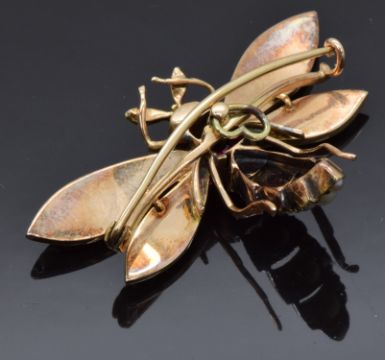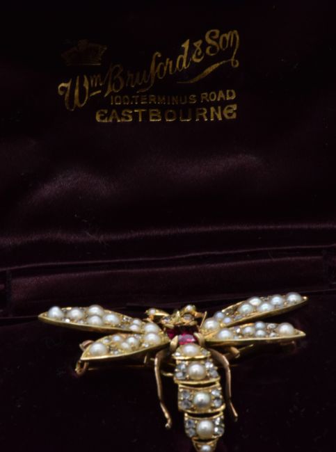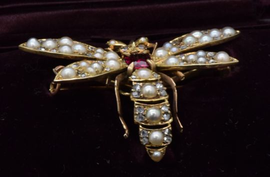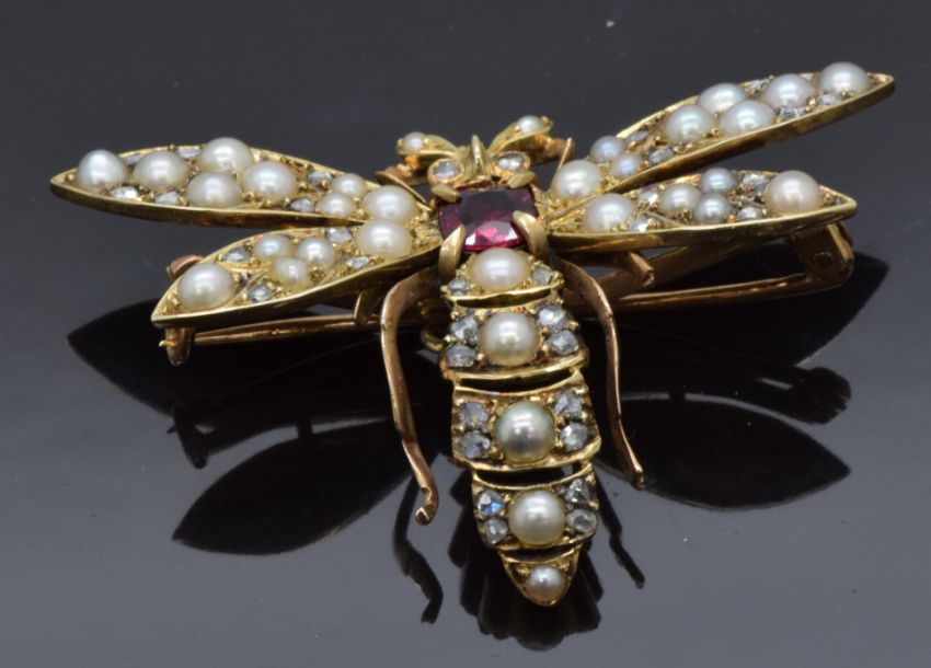 Victorian rose gold brooch in the form of a dragonfly set with seed pearls, old cut and rose cut diamonds and a cushion cut ruby of approximately 0.75ct, in original box, 4.5 x 3.1cm