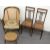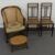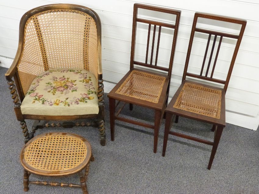 Three bergere chairs, one with tapestry upholstery, barley twist legs and a footstool