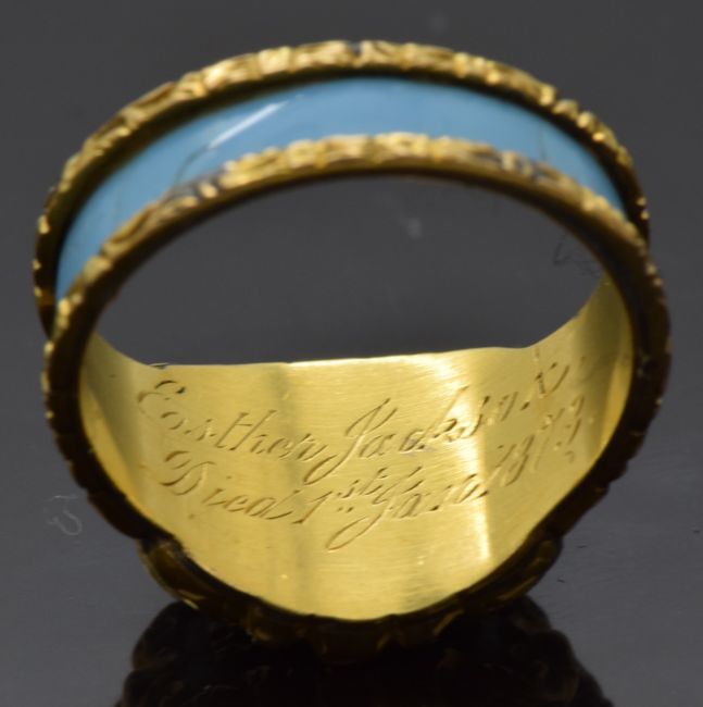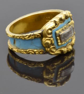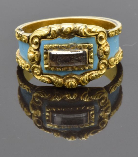 Victorian mourning ring set with plaited hair to the central glass compartment, with turquoise enamel and with scrolling gold decoration, inscribed to inner band "Esther Jackson died 1st January 1873", size O, 5.73g