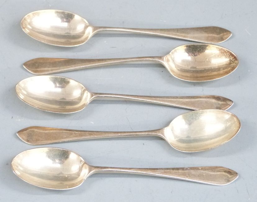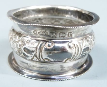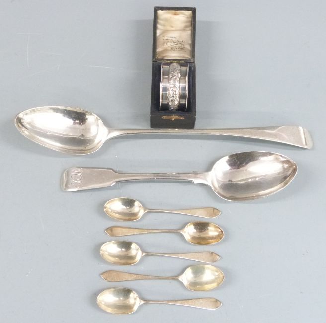 Georgian hallmarked silver basting spoon, London 1787, maker's mark rubbed, length 29cm, fiddle pattern hallmarked silver table spoon, five hallmarked silver teaspoons and a cased hallmarked silver napkin ring, weight 230g