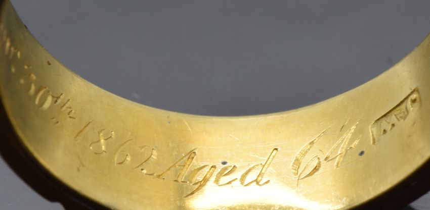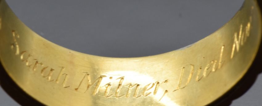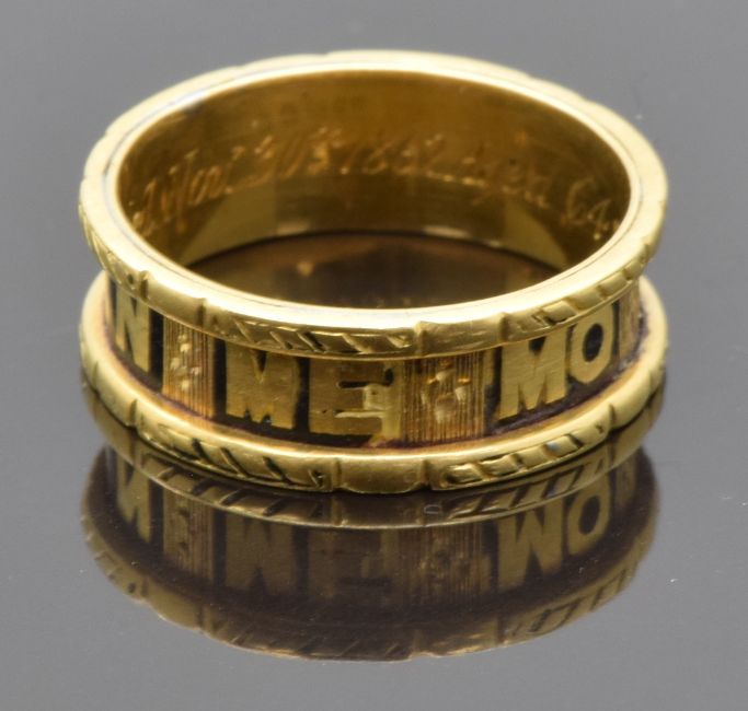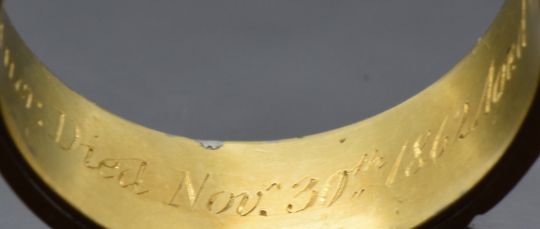 Victorian 18ct gold mourning ring set with black enamel reading "In memory of", inscribed to inner band "Sarah Milner, died November 30th 1862 aged 64", London hallmark, maker JW, size M/N, 4.23g