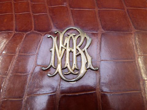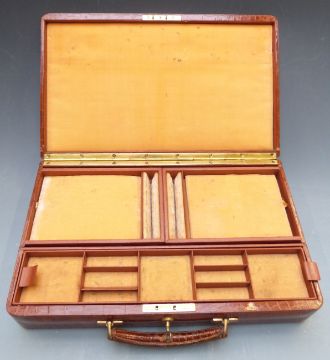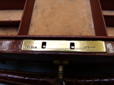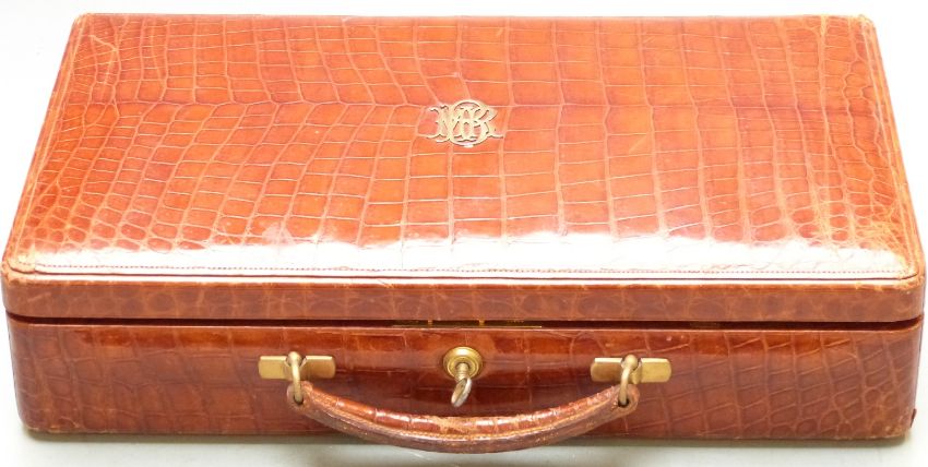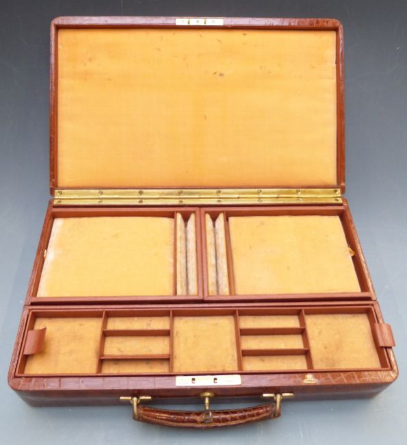 J.C. Vickery crocodile skin travelling jewellery case with two fold out sections and Bramah lock, length 39cm