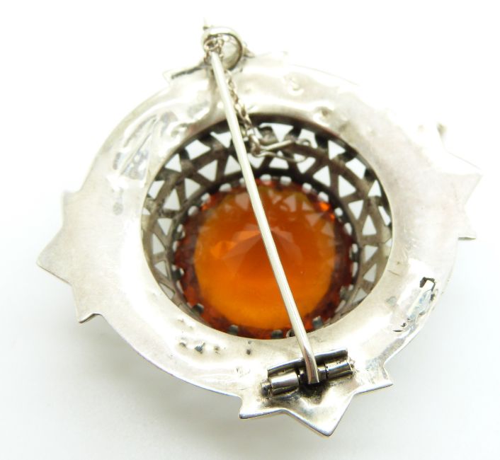 Scottish white metal kilt pin/ brooch set with a citrine and agate, 5cm diameter