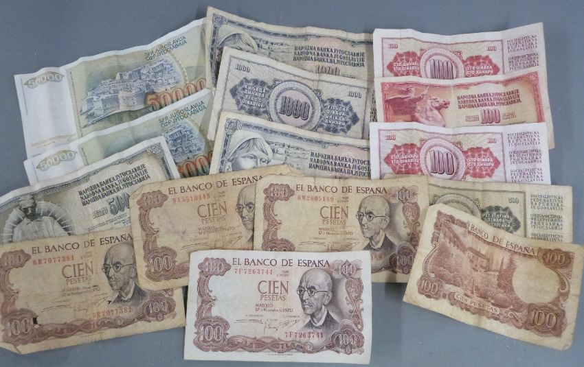 A collection of largely UK coinage to include Victorian and Edwardian silver examples (total mixed silver approx 195g) together with a quantity of 1970's Spanish and Yugoslavian banknotes