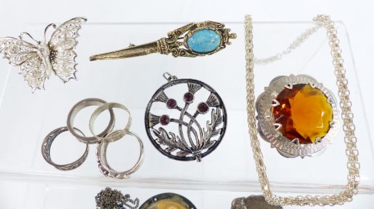 A collection of silver jewellery including ring, Scottish silver brooch by WBS, silver necklaces, Miracle brooch, David Andersen enamel brooch, agate brooch, two Folli Follie bangles, etc