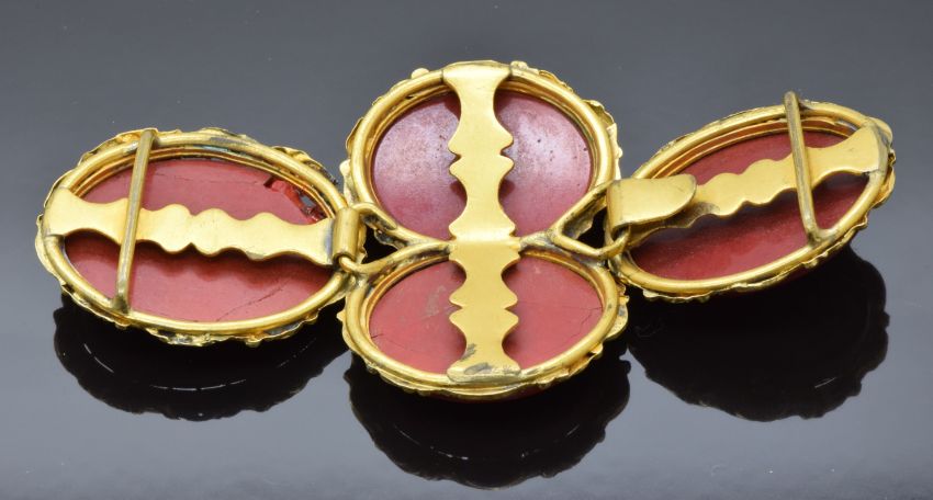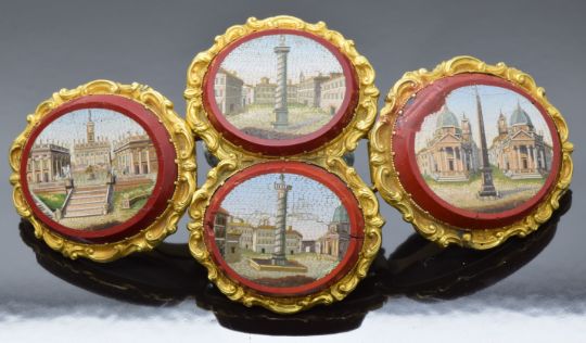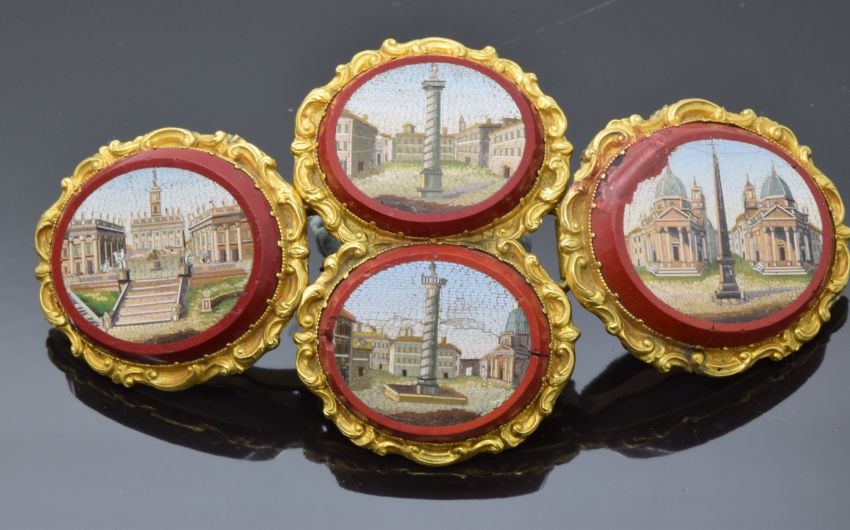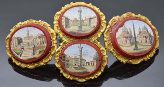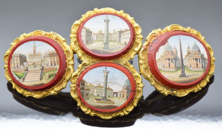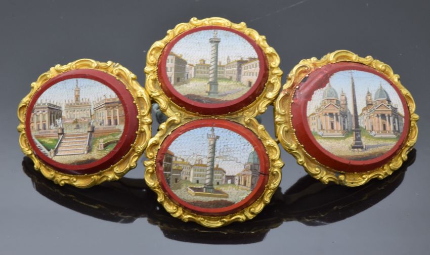 A 19thC micro mosaic buckle formed of four micro mosaic plaques depicting buildings, in gilt mounts, 10.5 x  5.5cm