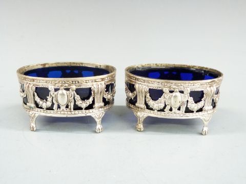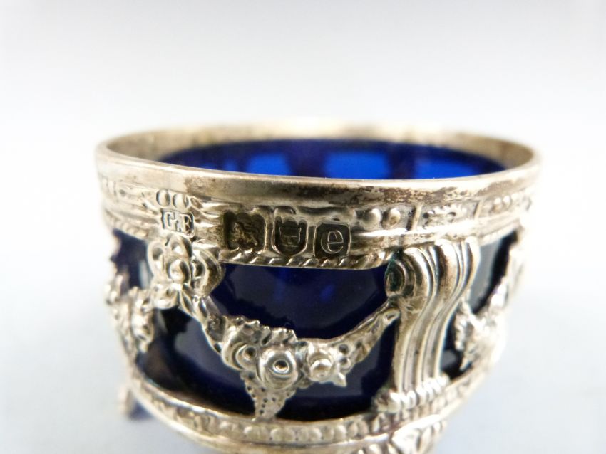 Pair of Victorian hallmarked silver salts with blue glass liners, raised on four feet, London 1900 maker's mark GF, length 8cm, weight without liners 158g