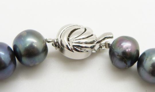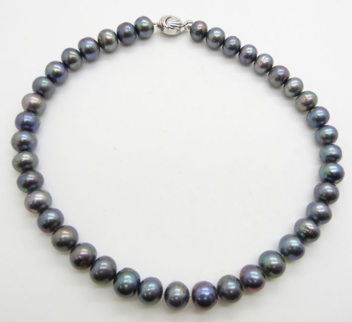 A single strand of Tahitian pearls with silver clasp, 42cm long
