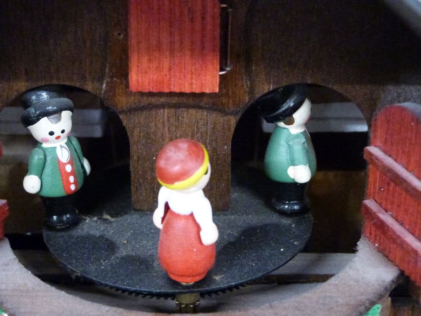 Swiss made 20thC three train cuckoo clock with musical movement on the hour and half hour and waterwheel and dancers automaton feature