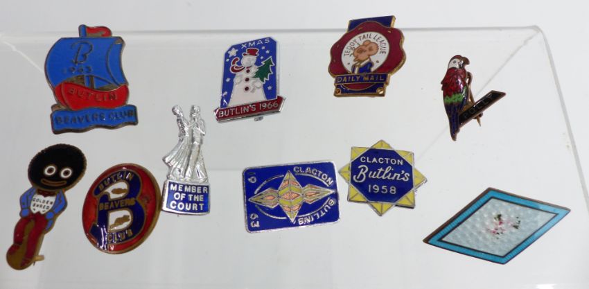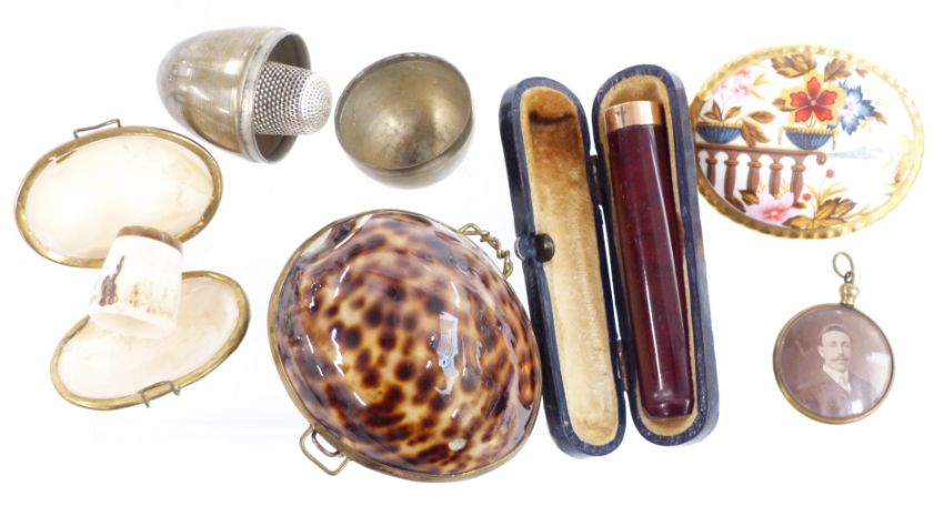9ct gold and amber cheroot holder, military badges, guilloché enamel brooch, RAF sweetheart compact, Butlins badges, Charles Horner silver thimble etc