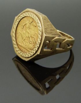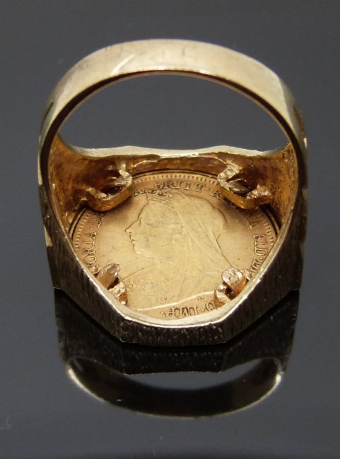 An 1896 gold half sovereign in 9ct gold ring mount, size V, 11.88g