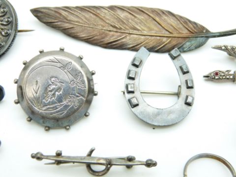 A collection of silver brooches including enamel butterfly set, marcasite pheasant, Victorian horseshoe (Birmingham 1890), sapphrite, etc