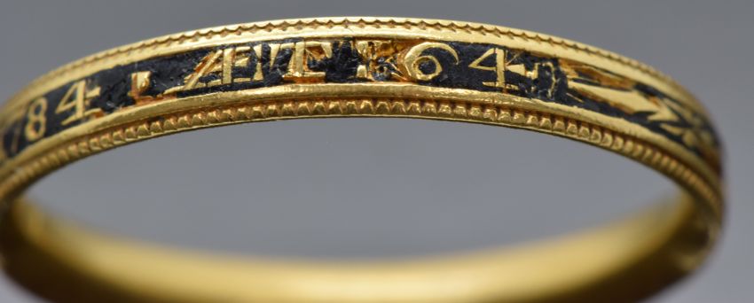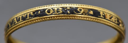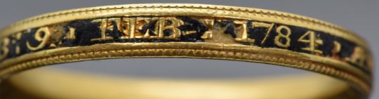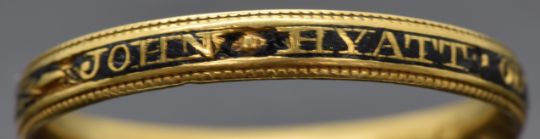 Georgian mourning ring set with black enamel reading "John Hyatt Ob 9th February 1784 at 64", size U, 4.27g
