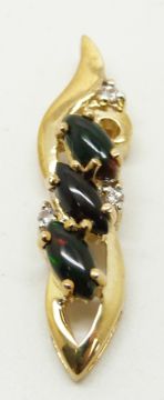 A 9ct gold pendant set with three marquise cut Mezezo opal cabochons and white sapphires, 3.8g