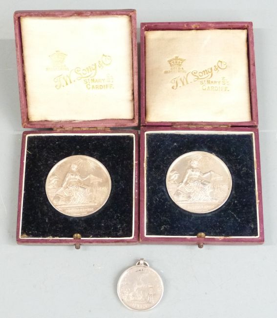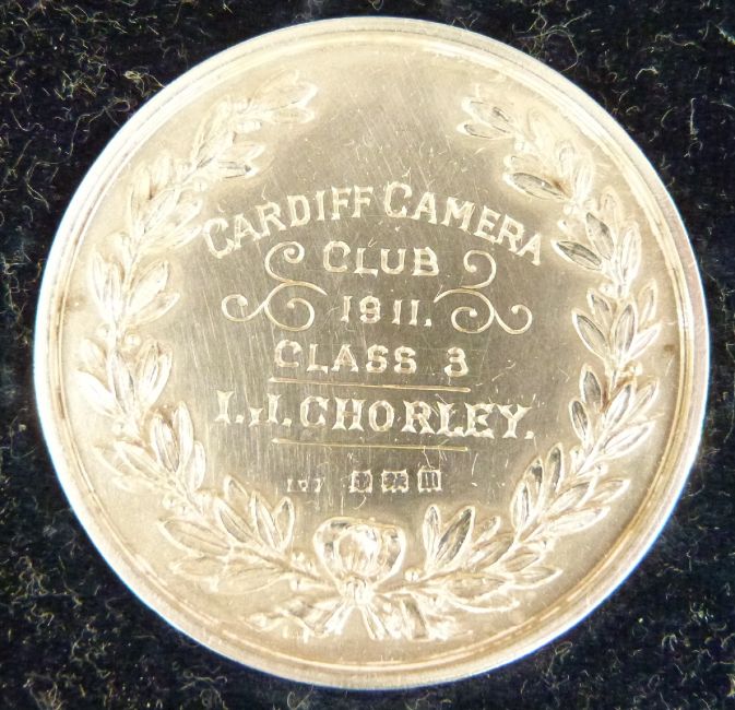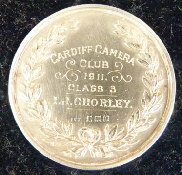 Three Cardiff Camera Club hallmarked silver medallions dated 1911, 1911 and 1913, two awarded to I.J.Chorley, all depicting a lady operating a plate camera, diameter of largest 38mm, weight of all three 61g, two being in original fitted cases