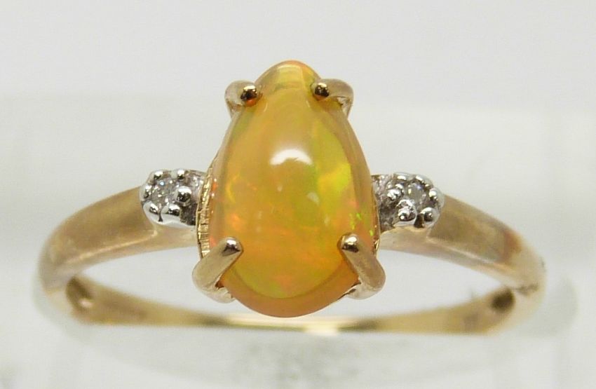 A 9ct gold ring set with a pear cut opal and diamonds, 1.9g, size N