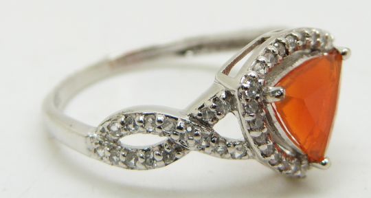 A 9ct white gold ring set with a trilliant cut Mexican fire opal and zircon and a 9ct gold pendant set with a trilliant cut Mexican fire opal and diamonds, 3.7g, size N