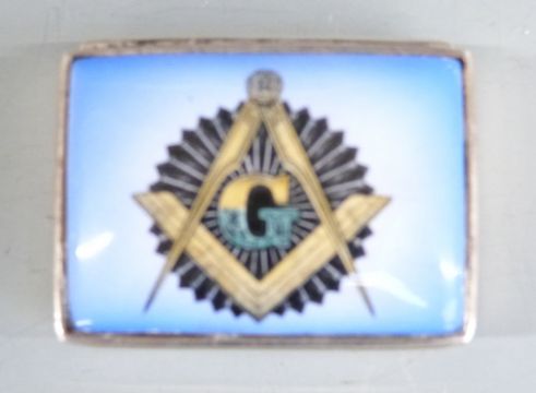 White metal Masonic interest trinket pot with enamel decoration to lid and marked 925 to base, width 3.5cm