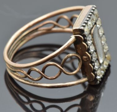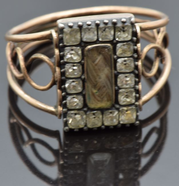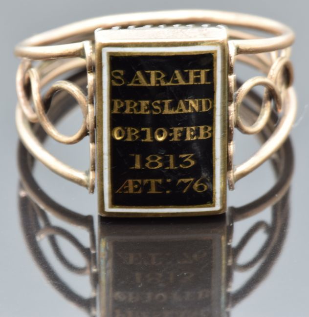 Georgian mourning ring set with plaited hair in a glass compartment surrounded by foiled paste, swivelling to reveal a black enamel plaque "Sarah Presland OB 10th February 1813 age 76", size U/V, 6.17g