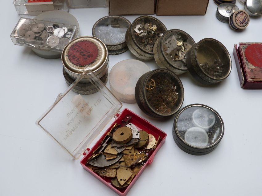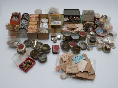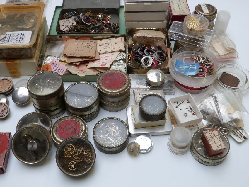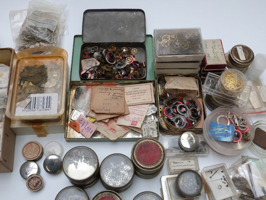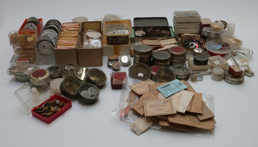 A large quantity of mainly pocket watch parts and spares, many new, including glasses, crowns, wheels mainsprings etc