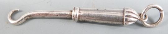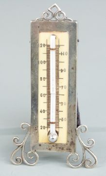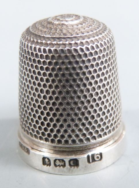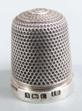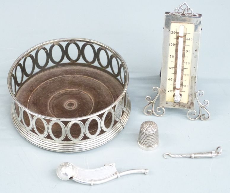 Hallmarked silver mounted thermometer, white metal bosun's whistle, hallmarked silver thimble and a 19th century wine coaster, diameter 10cm