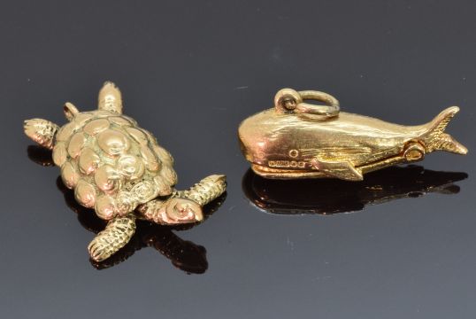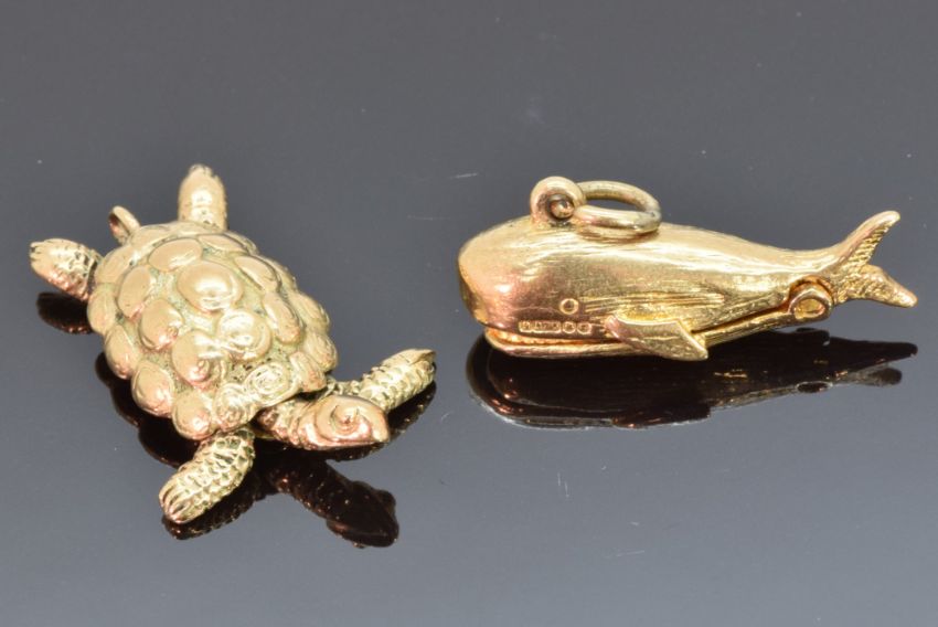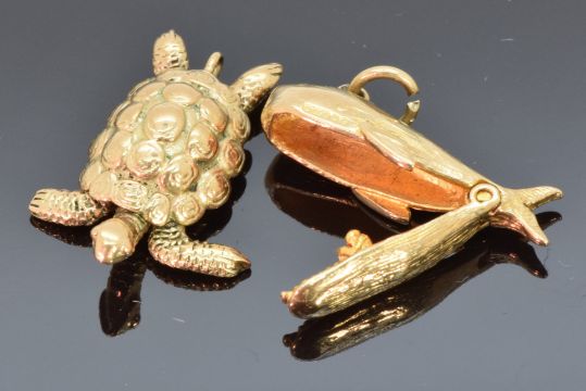 A 9ct gold charm depicting a whale opening to reveal Jonah and a 9ct gold charm depicting a turtle, 7.3g