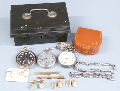 Three keyless winding open faced pocket watches, one continental silver, one military style with luminous hands and markers and black dial and one with silver dial, together with a pair of silver cufflinks, tie clips etc, in a metal cash box.