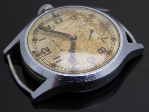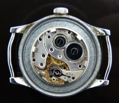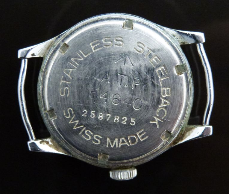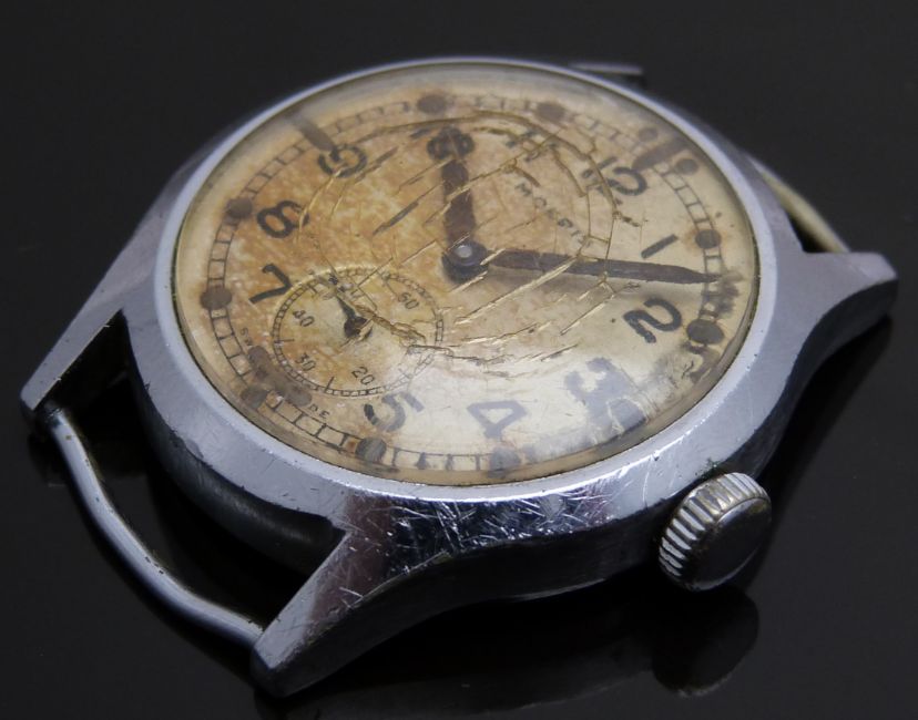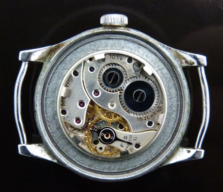 Moeris gentleman's military wristwatch with subsidiary seconds dial, Arabic numerals, silver dial, railroad minute track, case back marked 'A.T.P 54640' below broad arrow, and signed 15 jewel movement, case diameter 33mm, serial number 2587825.