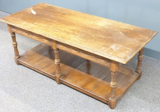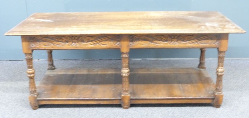 An oak coffee table with carved decoration to the sides and legs, W122 x D54 x H46cm