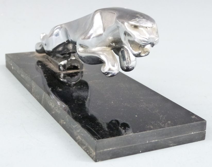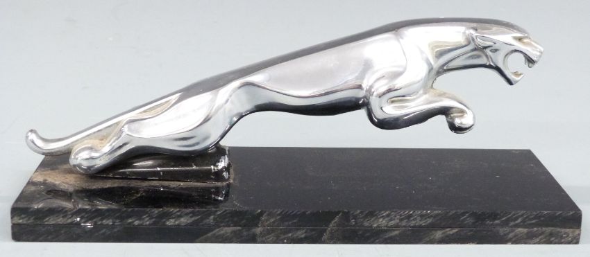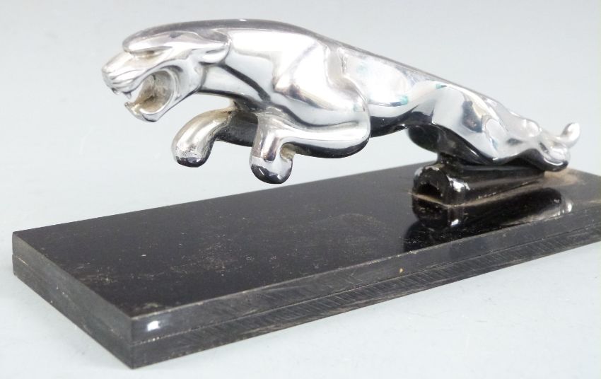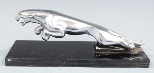 Chrome Jaguar car mascot on black display base, length of mascot 19.5cm