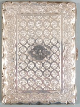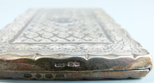 Victorian hallmarked silver calling card case with engraved decoration, opening to reveal lined interior and pencil with ivory aide memoir leaves, each labelled with a day of the week, Birmingham 1894 maker Frederick Marson, length 10cm, weight 100g all in