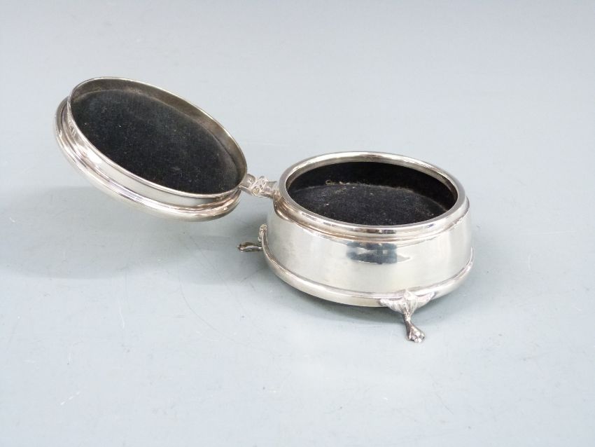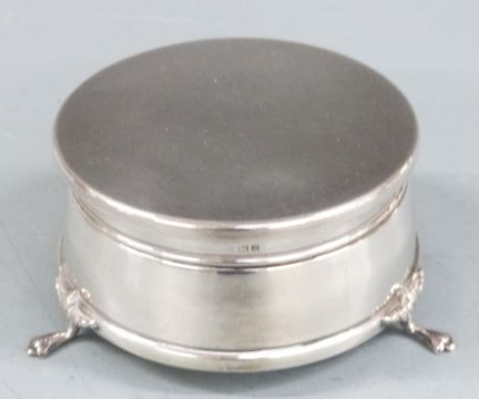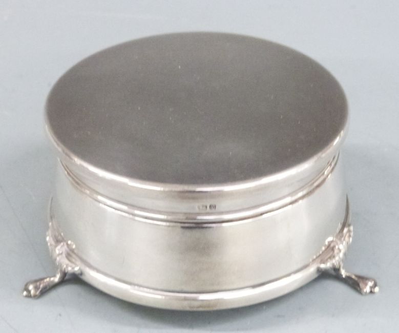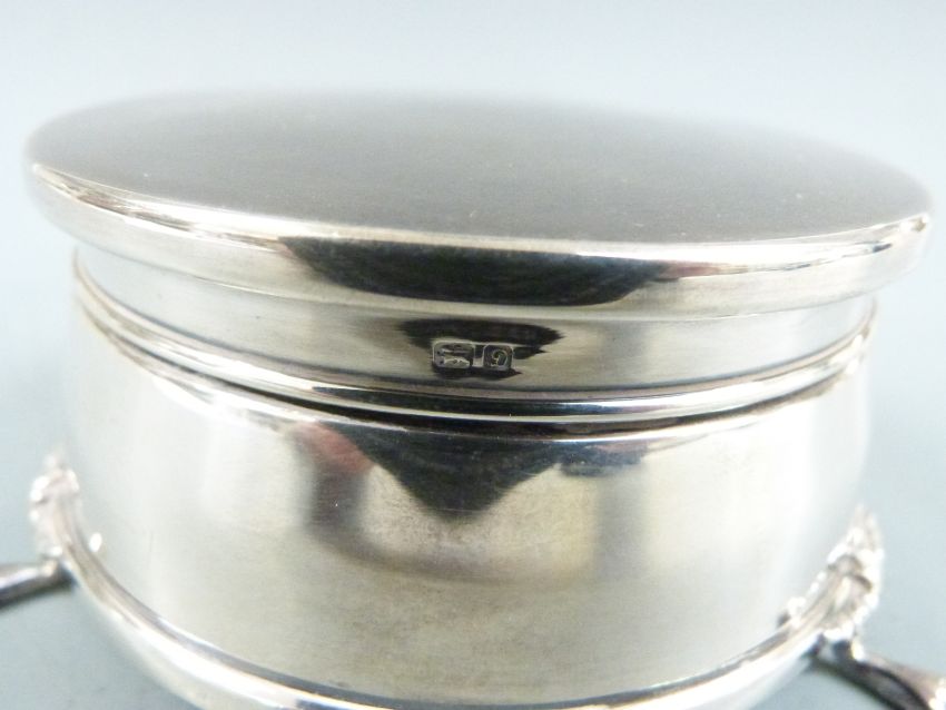 Hallmarked silver circular dressing table pot raise on three feet, Birmingham 1978 maker W I Broadway & Co, diameter 9cm
