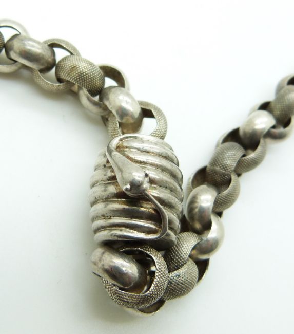 A large Victorian silver necklace made up of alternating textured and plain links, with unusual barrel shaped clasp in the form of a coiled snake holding its tail, length 117cm