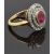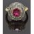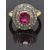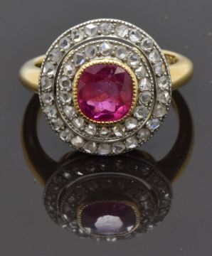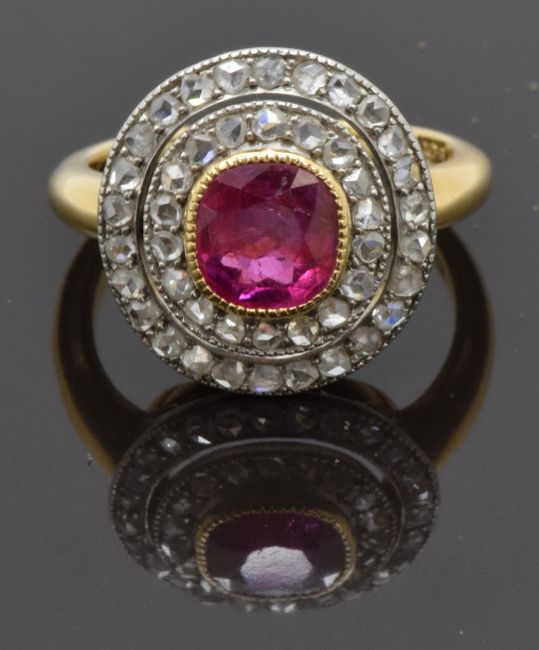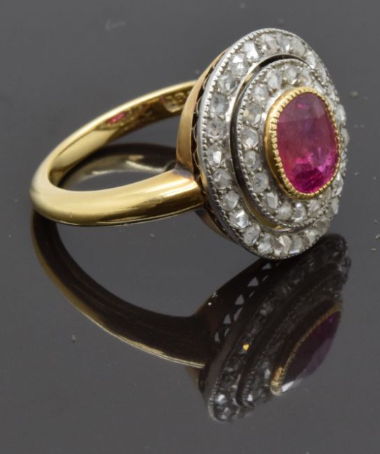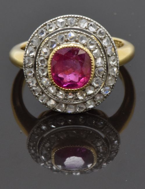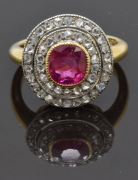 Victorian 18ct gold ring set with a cushion cut pink sapphire surrounded by two tiers of old cut diamonds, size K, 5.34g