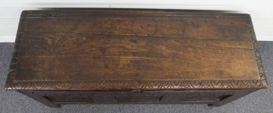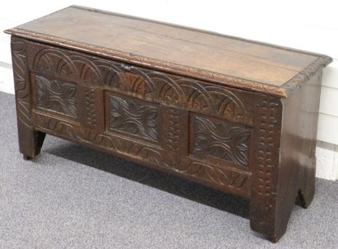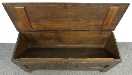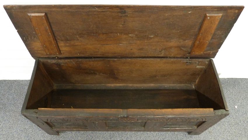 A 17th/18thC oak coffer with carved decoration, W107 x D37 x H53cm