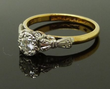 An 18ct gold ring set with a round cut diamond in a platinum setting with bow detail to the shoulders, size M, 3.19g
