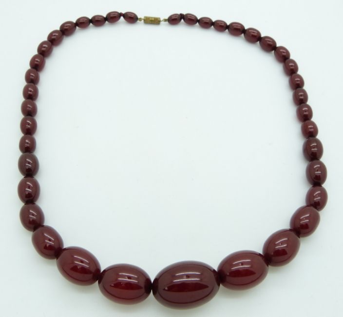 A graduated cherry amber necklace made up of 39 beads, largest bead 21mm x 30mm, 56g