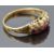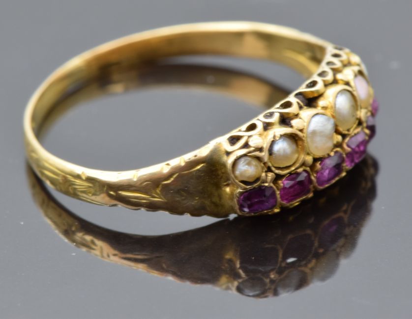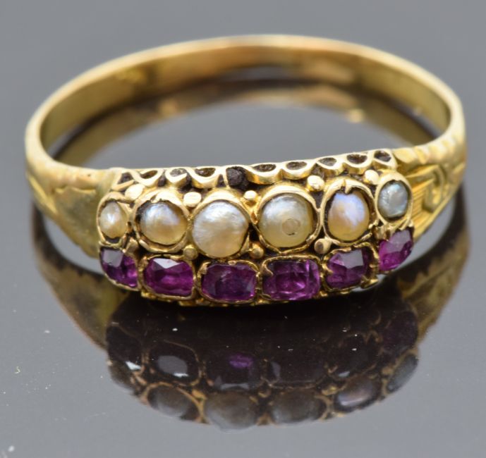 Victorian yellow metal ring set with seed pearls and foiled rubies, size M